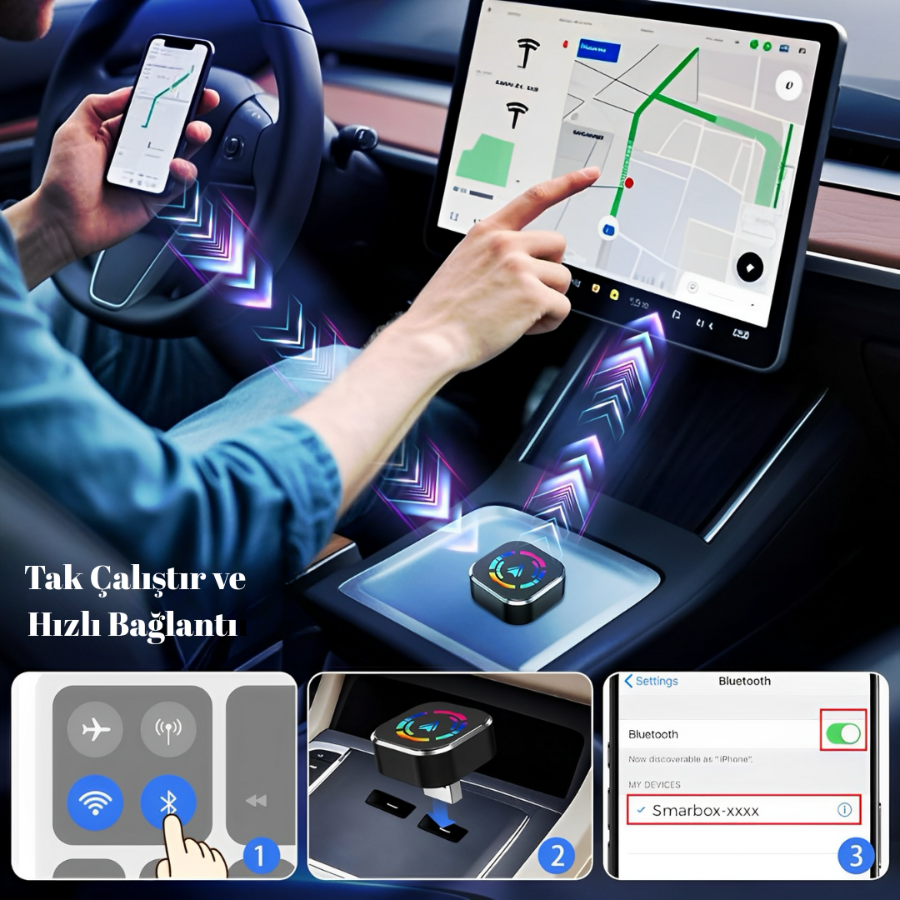 - Adaptör, telefon ile aracın CarPlay sistemini kablosuz olarak bağlar. Bluetooth ve Wi-Fi ile hızlı ve stabil veri aktarımı sağlar.